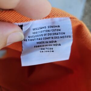 The Williams Sonoma Kids Jack-o-lantern Pumpkin Apron is a classic and festive addition to any young chef's kitchen attire. Made of comfortable cotton material in a bold orange color, this adjustable apron features a playful pumpkin pattern perfect for Halloween or everyday use. The one-size design ensures a comfortable fit for kids, allowing them to assist in the kitchen with style and safety. Ideal for young cooks looking to add a touch of fun to their cooking experience. Pre-owned