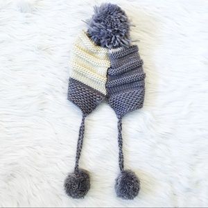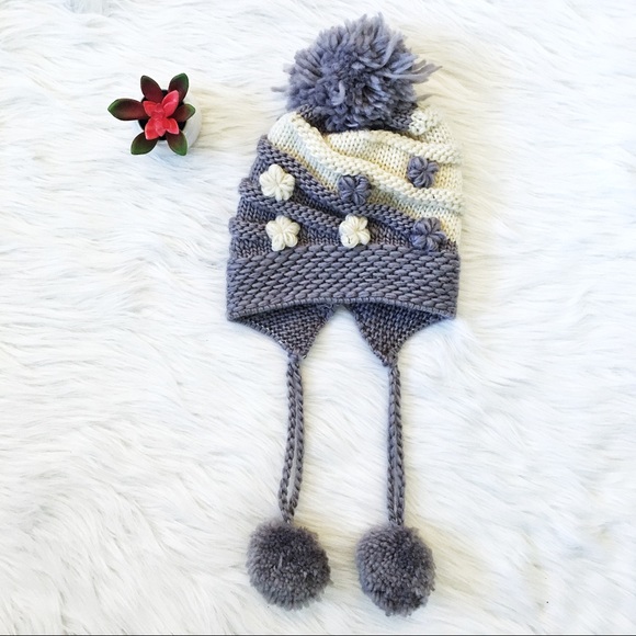 Adorable winter hat with warm inner lining. Small ivory yarn flowers decorate the hat.