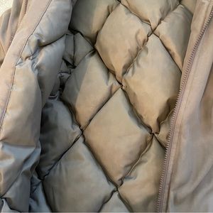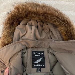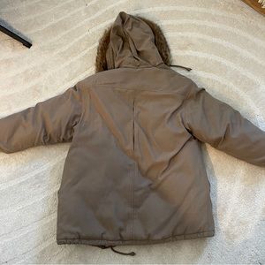 broma sport taupe heavyweight winter jacket. padded on the inside for extra warmth. buttons on sleeve, fur hood, adjustable tie at the bottom, full zip closure along with buttons. size xs petite. no flaws