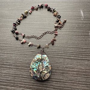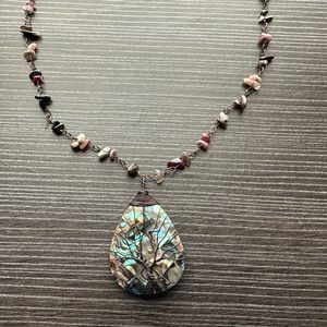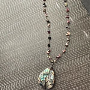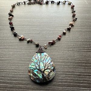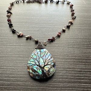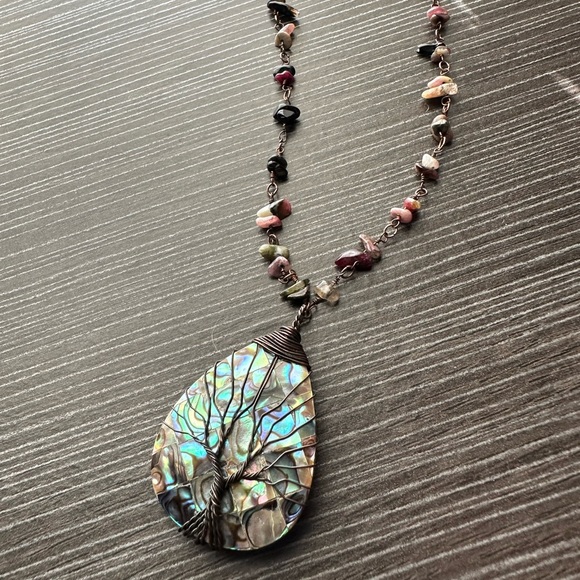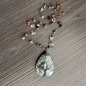 Handmade glass beaded chain, with the abalone teardrop pendant, wire wrapped tree of life around the pendant. Chain is 18" long. Gently linked one by one with glass stone chip beads on every link. Clasp closure and 2" extender. Pendant alone is about 1.75"-2" long.