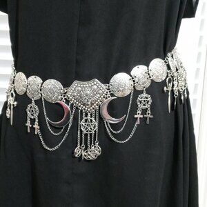 Add mystical flair to any outfit with this striking plus-size chain belt. Featuring detailed silver-tone medallions and an ornate center plate, this statement accessory is adorned with dangling ankhs, pentacles, crescent moons, and layered chains for a dramatic, witchy aesthetic.