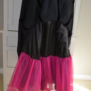 Patra, size 9/10. black velvet, lined, strapless, inside bottom of dress has pink netting, zipper in back