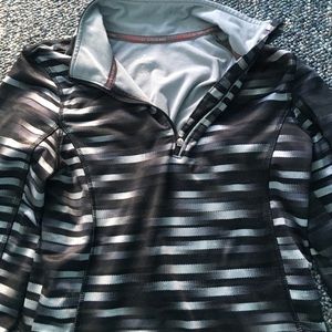 womans pullover long sleeve blouse with black and white stripe. size xs by warm systems. great condition. 89 percent polyester. 12 percent spamdex.