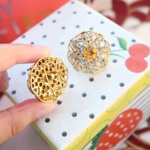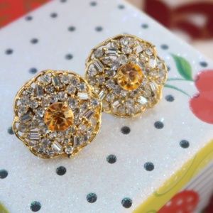 overall golden metallic studs with orange crystal in the center and transparent white crystals on the sides