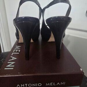 The product is a pair of women's heels in size 8.5 medium, featuring a navy blue sling back design by Antonio Melani. These high heels have a cone style heel, height of 3-3.9 inches, making them a stylish and comfortable choice for occasions where a fashionable footwear option is desired. The open toe design adds a touch of elegance, while the slip-on closure offers convenience and ease of wear. Perfect for adding a pop of color to any outfit, these heels are a versatile and chic addition to any wardrobe.