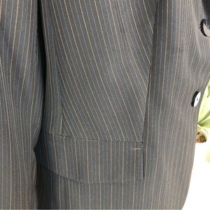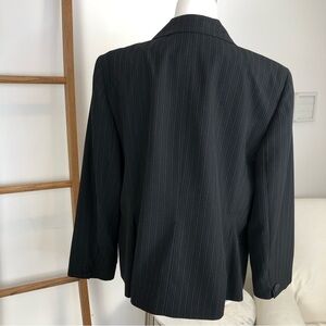 This is a beautiful tailored blazer by Jones New York. It’s a size 14 and in like new condition. Pinstripes are a trending now but they are also a classic timeless look. The blazer is black with very fine thin pinstripes in blue and tan which work harmoniously together. There are countless ways to style it, my favorite is with a white button down and jeans. Great for the office.