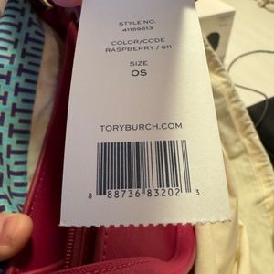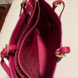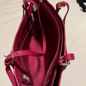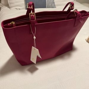 Multi compartment leather cranberry tote bag. Never been used, in original packaging with tag.