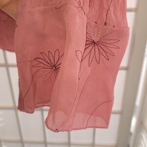 Semi sheer with button down front, lace scalloped details and flowy sleeves. Versatility from day to evening wear by simply changing your shoes and adding a skirt or your favorite pair of sexy pants. Gorgeous blouse!