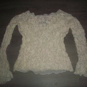Gorgeous ivory lace blouse. Lightly lined in the front. Sheer back. Has delicate bell cuffs. Beautiful blouse. BUT, has very slight discoloring in a couple spots. See pics. My opinion is though, that the pictures highlight the issue more than the blouse actually looks.Made of nylon, rayon and 2% spandex.
