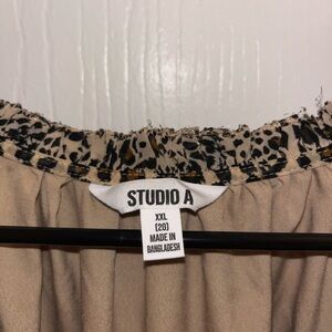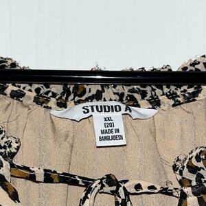 Channel your inner wild side with this stunning XXL cheetah print dress from Studio A. The dress features a round neckline with a keyhole cutout and tie closure, while the long balloon sleeves add a touch of elegance. The tiered A-line design and knee-length hemline make it the perfect choice for formal occasions such as weddings.