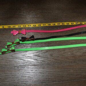 they are laying next to a tape measure so you can see the length all of these have a bow on the buckle their are 4 2 green, 1 pink and 1 black they are a faux leather belt very cute