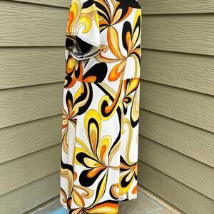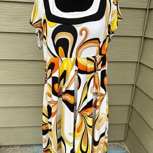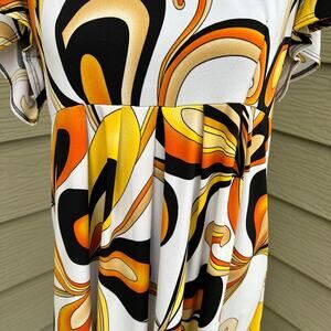 Size L women’s dress. Cap sleeves, high waisted. Scoop neckline. Gathered under bust. Polyester. White with black, orange, yellow and tan swirling of colors. Lightweight