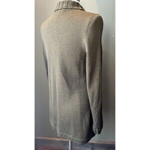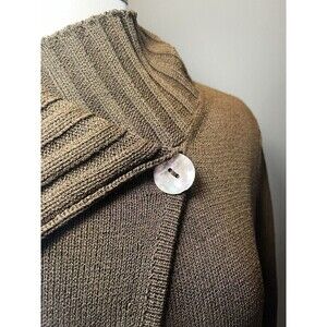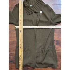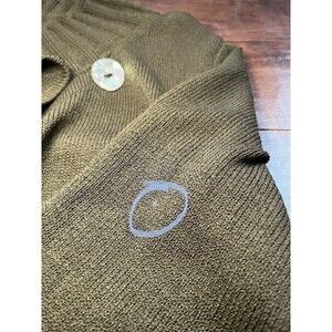 womens maria ficalora Single Cross neck button olive green Cardigan Size M. There are a few light marks as shown in photos but other then those noted marks the cardigan is in good condition! It is a longer length, on a size 6/8 mannequin. Please see photos for rough measurements and item condition