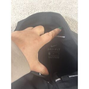 This is a women's Nike running quarter zip in size medium, with thumb holes and long sleeves. It is designed for casual wear and features a black color with a medium fabric wash. The top is suitable for activewear, particularly running and jogging. It has a regular fit and a zip closure.