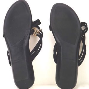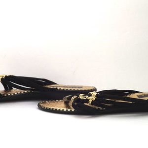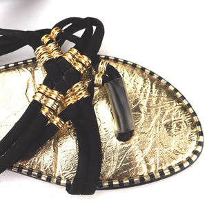 strappy beaded thongs 5 black rubber knotted straps man made slip resist ribbed soles gold metallic foot bed gold metal look plastic beads comfort plastic covered toe thong black & metallic gold striped edges good vintage condition gently/rarely worn no detected issues tag size: 6