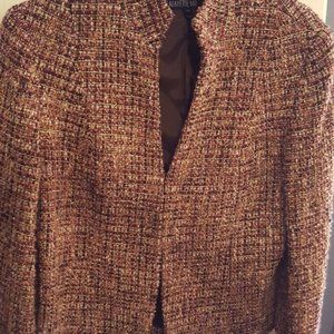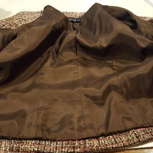 This Lafayette 148 New York blazer is in excellent condition (like new). The colors are brown, coral and beige. It is fully lined, the sleeves as shown in the photos can be cuffed or worn straight.