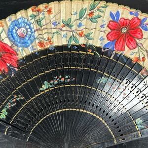 wooden hand painted florals- Vtg fan fabric end - 16 inches extended- some wear