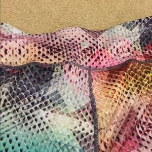 multicolored, 88% polyester 12% spandex. have been washed, only worn once, purchased a bit over a month ago. great for running, weights, or just lounging around and feeling colorful!