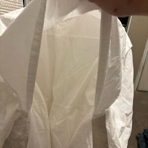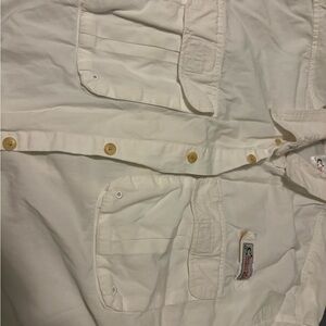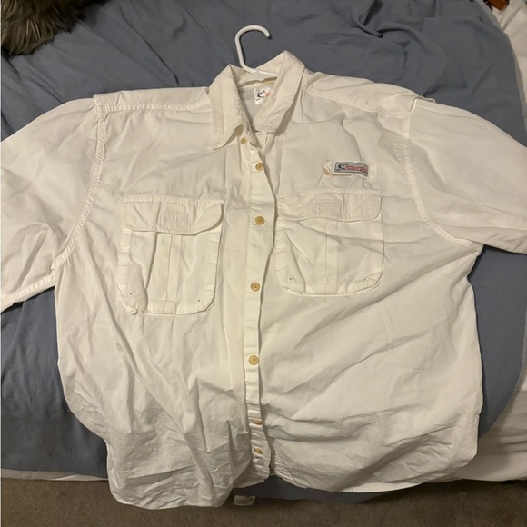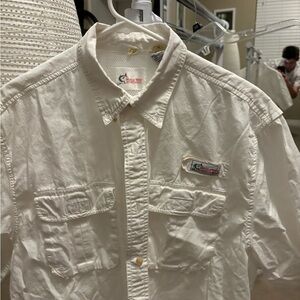 The shirt is solid white in color with an embroidered accent on the chest. It has a regular fit and is available in XL size. The shirt also has pockets and an open design, making it perfect for carrying fishing gear. This vintage-style shirt is perfect for those who love the beach, USA, nautical, fish, and outdoor themes.