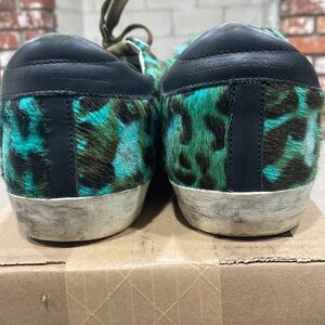 worn twice golden goose superstar sneakers womens euro 41 per gg chart womens 11...green emerald aqua brown pony hair leopard pattern gold star black leather toe...made in italy...there is a sticker on inside of left insole just fyi (pic 7)...comes with the usual gg the edge insole...please ask any/all questions b4 buying thank u....