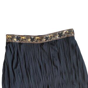 this skirt is double lined, made with a light weight, chiffon material that is pleated. elastic waistband with brown and amber beaded and sequin floral detail. skirt sits mid rise / low rise depending on your waist size.
