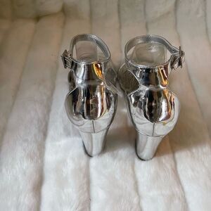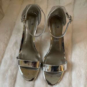 worthington metallic silver ankle straps block heels open toe size 9.5 in great used condition see all pictures any questions please message