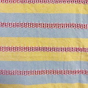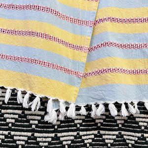 woven textile in stripes of muted blue, yellow, and pink with white fringe.