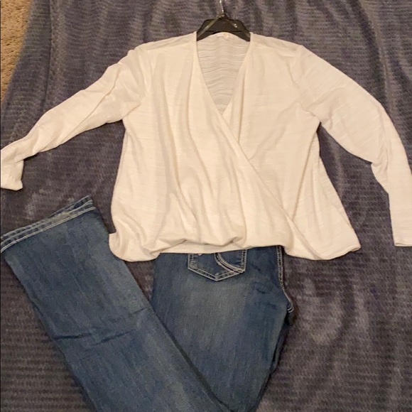 Off white wrap style top. Purchased at Charming Charlie’s. Falls at waist line. Looks great with dress pants or jeans- versatile