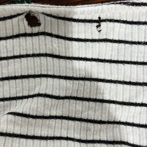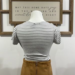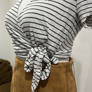 Black and white striped wrap top. Super cute! Has two small holes where the tag has been ripped off. Not noticeable when on! You can adjust it with the ties! Questions? Leave them in the comments!