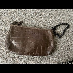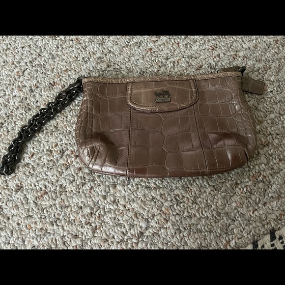 coach brand wristlet. Chain is metal and has some slight discoloration. it does have some slight wear and tear. Inside is lined purple.