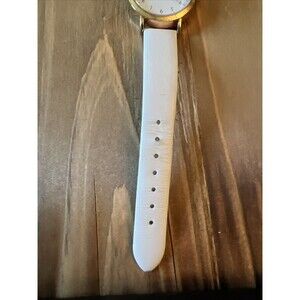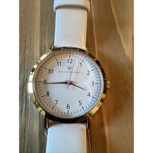 Working, pink seconds hand, easy to read numbers, white dial, gold tone case, and band