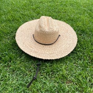100% raffia woven lifeguard style hat with a stampede strap and extra wide brim.