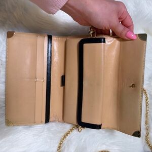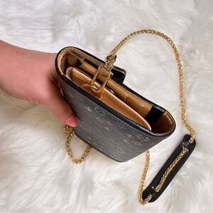 -Gold hardware d rings installed to support a crossbody chain silhouette.