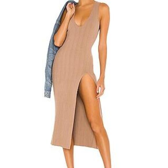 New with tags!! REVOLVE Variegated Rib Bodycon Dress by Michael Costello is a stylish and versatile piece. Made with 90% rayon and 10% spandex, it features a rib knit fabric, a back cut-out design, and is fully lined. This dress is perfect for any occasion and is available in a taupe color. Dry clean only. Imported.