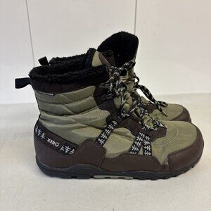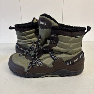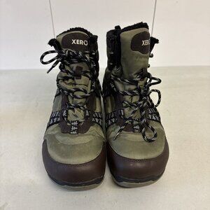 The Xero Alpine men's size 11.5 shoes are insulated barefoot waterproof snow boots designed for travel, activewear, and casual occasions. These lace-up boots feature a round toe shape, ankle shaft style, and solid brown green color. Made with synthetic upper material and a foam insole, they offer lightweight comfort and are suitable for winter, fall, and spring seasons. With a rubber outsole and waterproof design, these Xero Shoes are a practical and stylish choice for outdoor activities in colder weather.