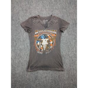Affliction graphic t-shirt with a bold design. This gray short sleeve top features a V-neck and rhinestone embellishments on the shoulders, adding a touch of edgy style. The focal point is a large graphic on the front, showcasing the Affliction logo above a bull skull and American flag. The words "Live Fast" encircle the design. This shirt would be great for casual wear, concerts, or adding an alternative edge to your everyday style.