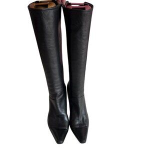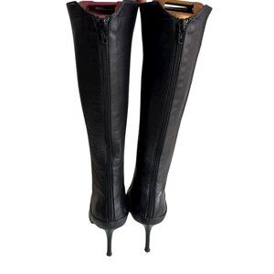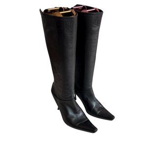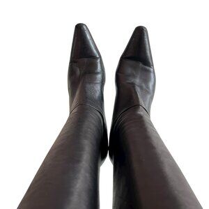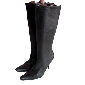 y2k Edmundo Castillo boots, super soft black leather, leather lining and soles, pointed toe, 13.5" tall shaft, 14" opening circumference, 4" stiletto high heel, zip up, US women's 8.5, preowned and shows wear on the soles, scuffs on the exterior, damage on the toe tips, worn heel caps - see photos.