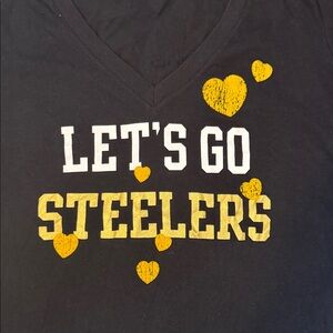 Black V-neck T-shirt with Steelers graphic and yellow heart accents.