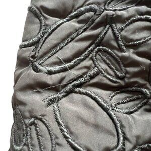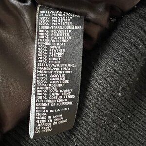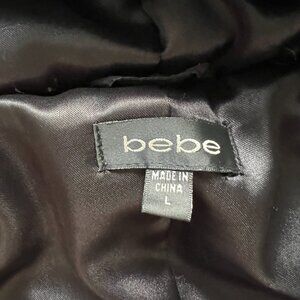 y2k Bebe jacket, black with embroidered bebe logo all over, down feather fill, rabbit fur trim on the hood, knit cuffs, short length, zip up with B zipper pull, women's fitted large, seems to fit small, please check measurements, pit to pit: 20.5", length: 21", sleeve: 25", preowned and has snags in the embroidery, pilling on the knit, spots on the sleeve - see photos