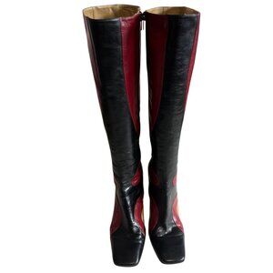 Vintage y2k Charles Jourdan boots, multicolor block leather, black, maroon and tan leather, squared toe, leather lining, rubber soles, side zipper, 3.25" block high heel, size 8.5, 15.5" tall shaft, 14" opening, preowned and shows wear on the soles, scuffs and residue on the exterior - see photos