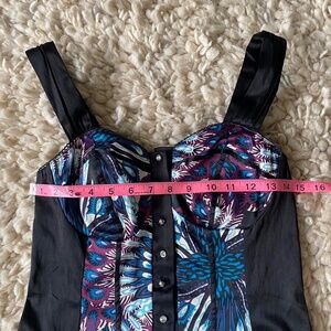 brand: studio y size: small, would fit medium best. had to pin it for pics cus it’s too big on me ): condition: perfect! - y2k corset with rhinestone clasps - snatches the waist - unique 2000’s style pattern #y2k #y2ktop #corset #y2kcorset #studioy