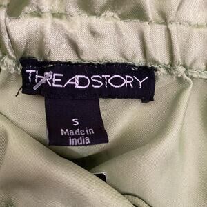 Vintage Green jumpsuit with tie waist brand is Threadstory. Has a stretchy waistband and is stretchy up top. Has a tie at the waist and side pockets. Material is polyester