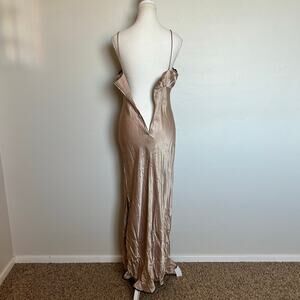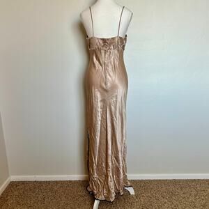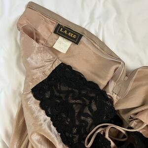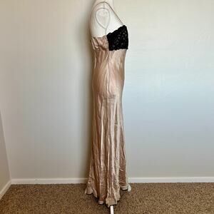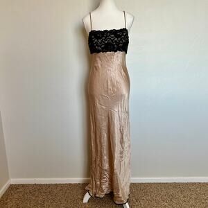 Gorgeous satin maxi dress with a black lace bust and a black lace trim hem with a slit on the side