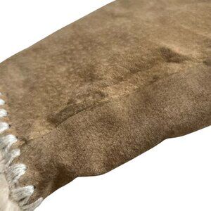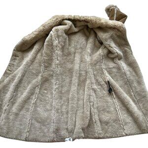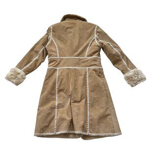 y2k Wilsons Leather coat, tan brown suede, faux fur lining, furry cuffs and big collar, button front, knee length, big stitched seams, women's medium, pit to pit: 18.5", waist flat: 17", length: 38", preowned and has marks/wear on the sleeves, stain on the lining - see photos