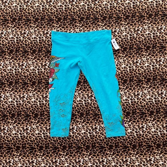 pair of bright iconic turquoise blue capri leggings with a multi-color tattoo-style graphic print on the lower legs.