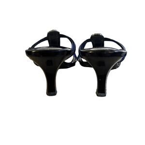 Very good condition,a little glue residue please see all photos.Black and silver rhinestone heel sandals with adjustable ankle strap
