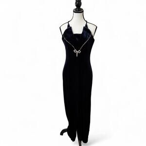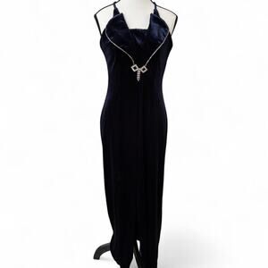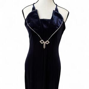 y2k vintage Navy Blue Velvet Rhinestone Bow Formal Prom Maxi Dress M/L