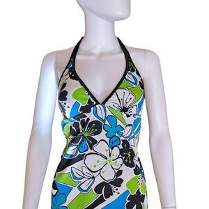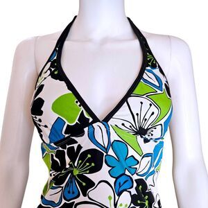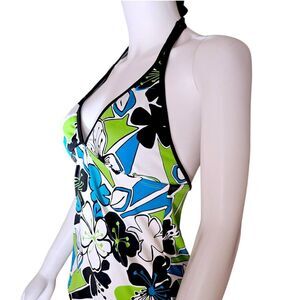 so so cute halter tank with abstract cool-tone floral & removable padding at bust. it’s a swim top but would b so cute w jeans or a mini
