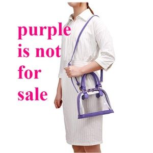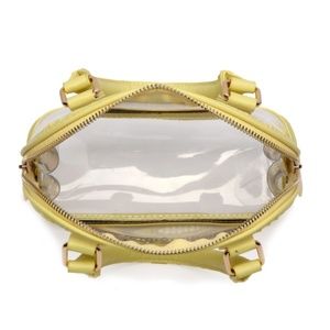 nwt new with tags bag see through crossbody stadium concert transparent clear retro bowling doctor barrel dome satchel handbag vinyl plastic pvc fake faux vegan leather trim pleather zipper handles small thru security sheer cute kawaii trendy hipster gold tone synthetic sports game bag compliant approved regulations NFL Venues Approved