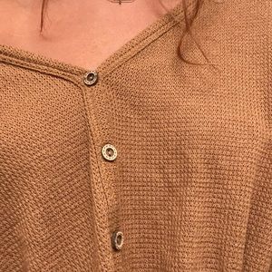 yellowish mustard on itted sweater with wooden buttons all the way down